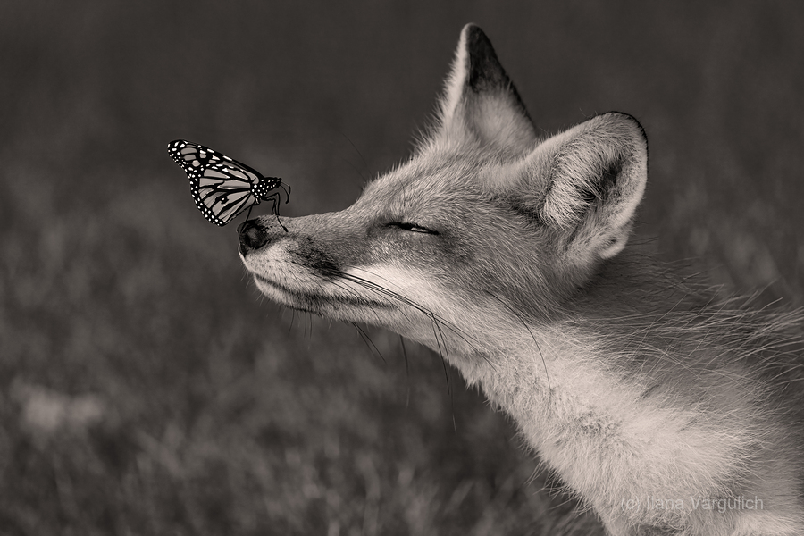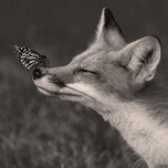 RED FOX WITH BUTTERFLY BW
